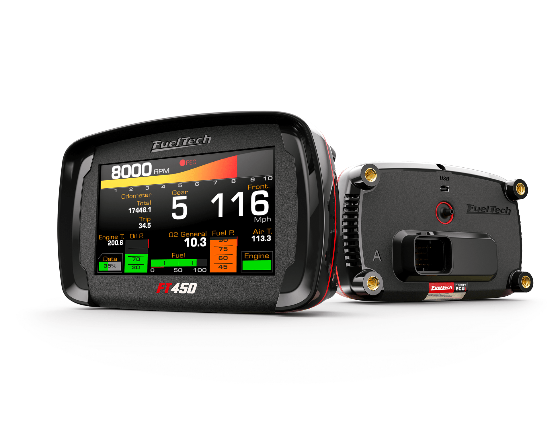 FuelTech's FT450 is the perfect ECU for projects with limited input and output channel needs, offering 7 configurable inputs and 10 outputs. This cost-effective aftermarket ECU is equipped with the same FTManager software and many of the same features offered in the FT550, FT550LITE, and FT600 including sequential injection and ignition, O2 closed loop, active traction control, integrated boost controller, internal datalogger, progressive and PRO-Nitrous controls, odometers, drag racing features and more! The touchscreen display offers an integrated dash display, eliminating the need for additional gauges, has 4 programmable screens, and a customizable splash screen. The IP67 rating makes it perfect for off-road and marine applications such as PWCs / Jet Skis.