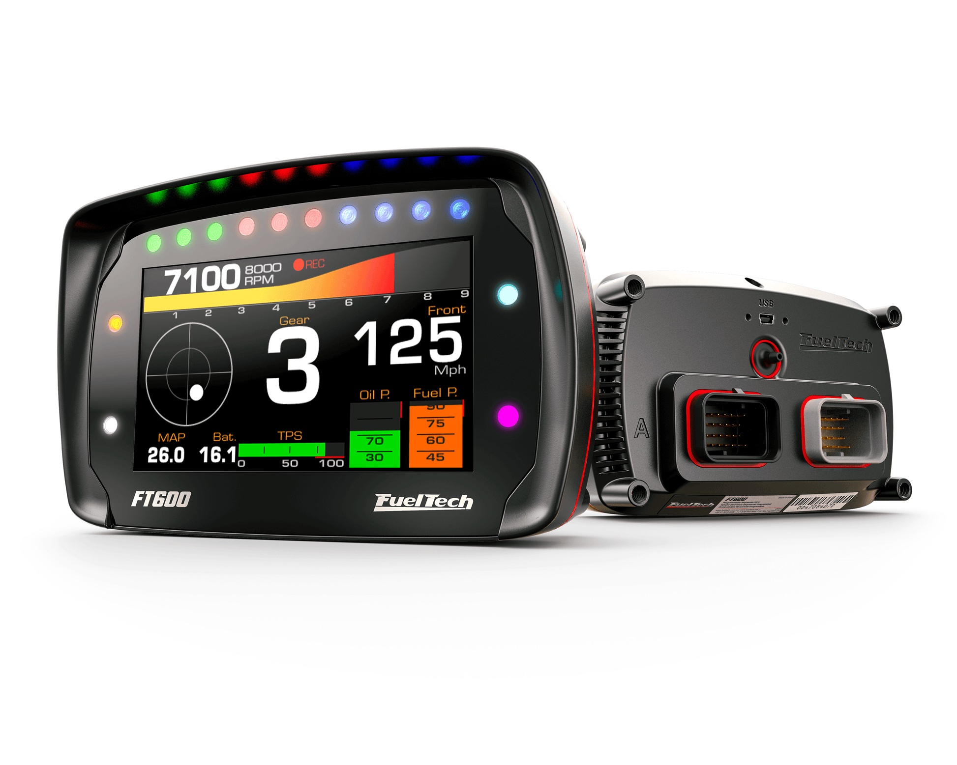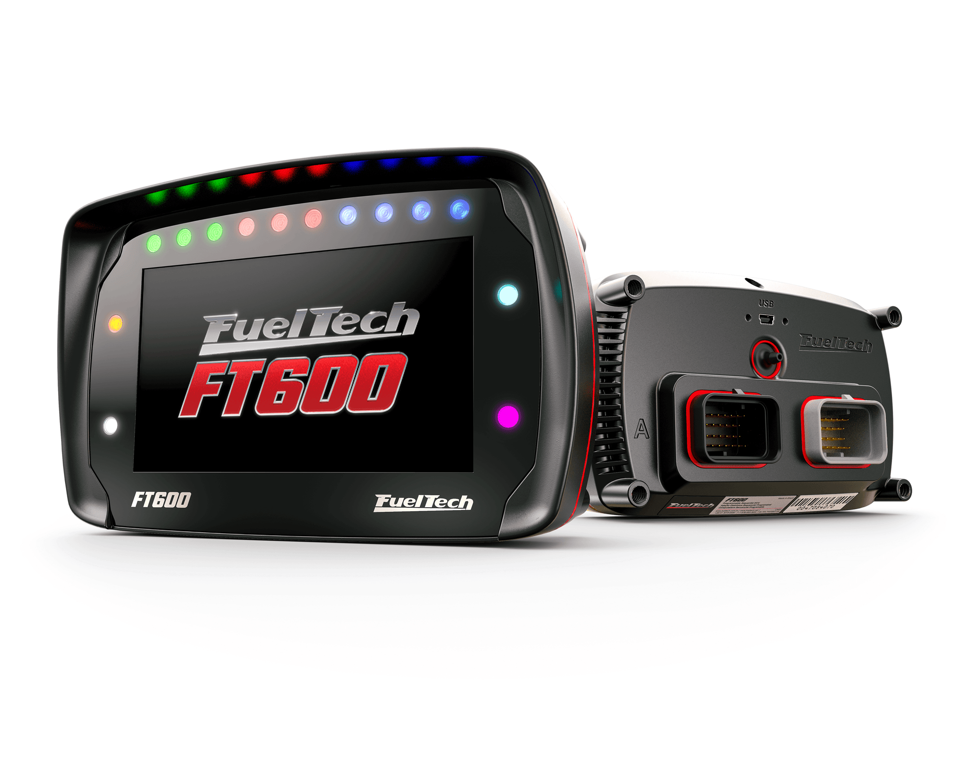 The FT600 ECU is our most advanced engine control and monitoring system. This top of the line ECU is capable of managing sequential injection and ignition on engines from 1 to 12 cylinders, or up to 4 rotors, and accommodates up to 20 inputs and 32 outputs. The FT600 offers the features and capabilities offered by the FT450 and FT550 models and more! Housed in an extremely durable aluminum case, the upgraded design also includes an upper visor to reduce glare and houses 10 LED lights with adjustable color and intensity, ideal for a progressive shift light. The 4 virtual LED lights on the FT450 and FT550 have been replaced with 4 adjustable LED lights, 2 on each side of the screen, that can be configured for alerts or to show the current status of any sensor. The 4.3” color touchscreen has been upgraded with an anti-glare display, integrated digital dashboard, 4 programmable display screens, and a customizable splash screen. The FT600 features dual 34 pin Super Seal connectors, 2 CAN Bus ports, and USB-A mini. Equipped with FT Manager software and an impressive list of features, including sequential injection and ignition, O2 closed loop, active traction control, integrated boost controller, internal datalogger, progressive and PRO-Nitrous controls, odometers, drag racing features, electronic throttle control, inclinometer gauge, integrated Gear Controller with strain gauge sensor on the shifter for more efficient gear shift cuts, built-in accelerometer (G-meter), gyroscope, and more! IP67 rated for marine and off-road applications.
